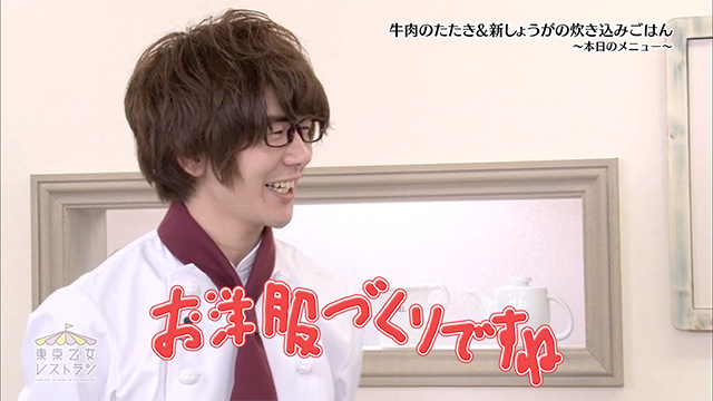 今回のテーマは和食ということで、料理中に日本酒を飲み始めたシェフふたり。牛肉のたたきをつまみ食いしつつ、ゴキゲンな森久保シェフ。そしていつも以上に酔ってしまったのか、なんだか暴走気味の花江シェフ。ちょっぴりハメをはずしたふたりの様子にも注目です。