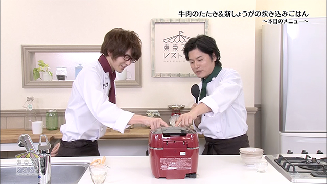 ごはんが炊きあがり、炊飯器をオープンする時のふたりの様子は必見! しゃもじをマイク代わりにしてインタビューごっこをする森久保シェフや、ごはんの匂いをかいだりオコゲに大喜びの花江シェフなど、とっても楽しそうです♪