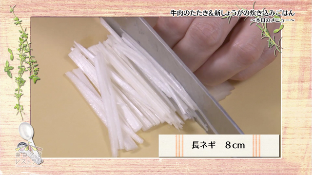 (3)牛肉を焼く間に、白髪ネギを用意します。長ネギを4cmほどに切って、縦に切り込みを入れて芯を取り出します。外側を広げて、細切りにするだけで出来上がり!火にはかけず、水にさらしておきます。