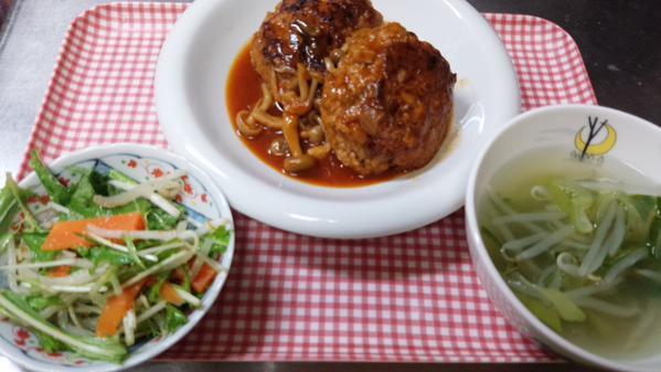 コメント:番組をみたら皆さん楽しそうにお料理してて、つられて自分もおからハンバーグともやしのナムル作ってみた(*´◒`*)ソースのしめじを舞茸に変更してチーズ好きの家族のためにハンバーグにチーズを仕込んでみました!