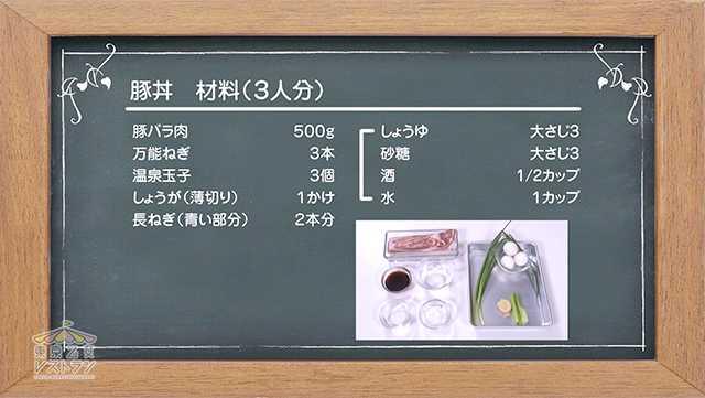 (5)どんぶりにご飯を入れ、豚肉と煮汁を乗せます。さらに市販の温泉玉子や万能ねぎをあわせて、完成です!